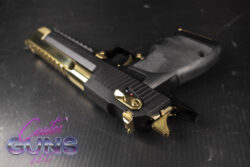 The Mark XIX L6 in .50 AE, .44 Magnum and .357 Magnum are about 10 oz. lighter than other similar Desert Eagle models. They are offered with a hard-coat anodized black aluminum frame, stainless steel or durable black finished slide, and 6” barrel with integral muzzle brake. Hogue® finger groove rubber grips, top picatinny rail, and frame accessory rail are included. Overall length is 10.75”, height is 6.25”, and the slide width is 1.25”.